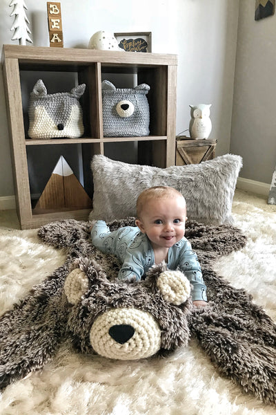 ClaraLoo Brown Frosted Minky Bear Rug. This plush faux fur rug is lined with a soft flannel fabric and features crochet ears and muzzle.