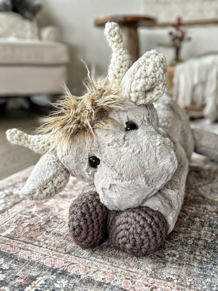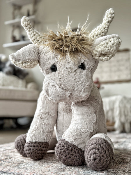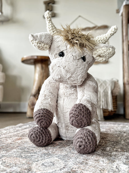 Snuggle up with this plush highland cow stuffed animal. This handmade highland cow is made with soft tan faux fur and measures approximately 21 inches tall. This stuffed highland cow features crochet horns, ears, and feet. This handmade highland cow plush will become your new favorite companion!